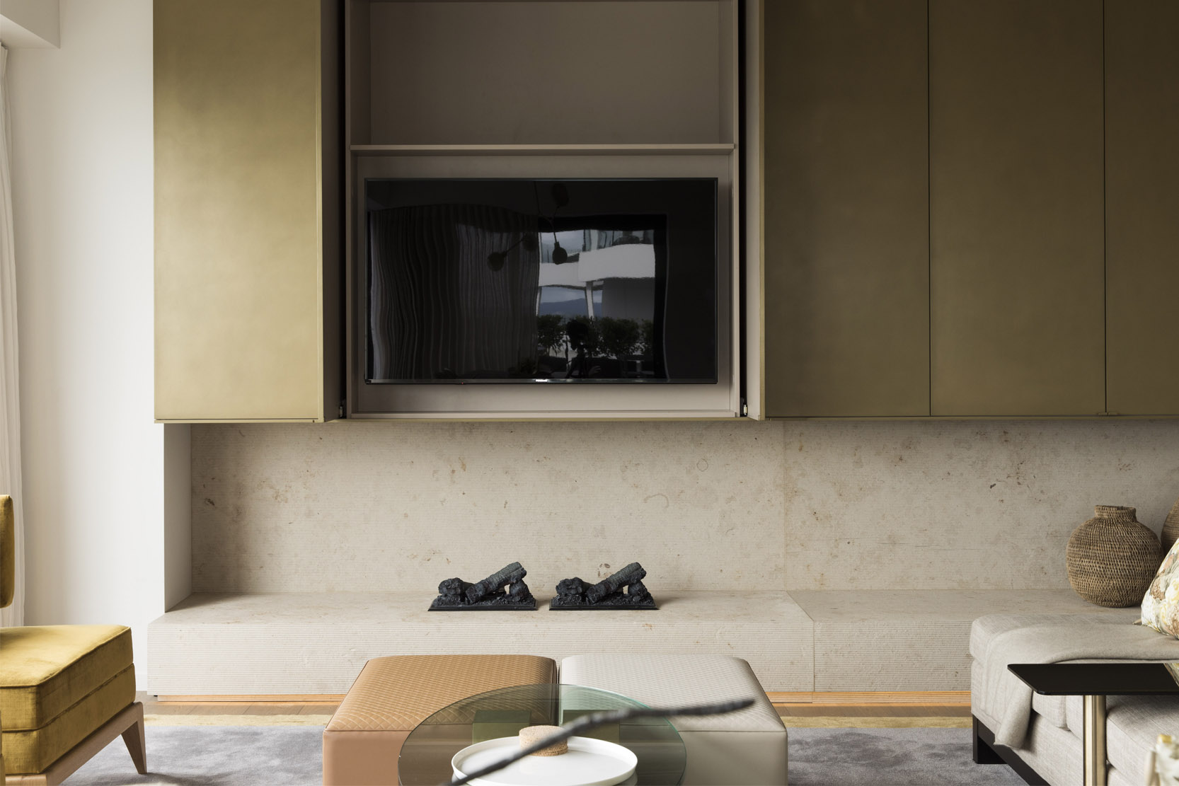 A central Auckland apartment with magnificent views of the harbour. Hare Interiors has created a calm retreat away from the bustle of Ponsonby Road. A subtle palette within the interior is complimented with textural stones, bold forms and accents of colour. A custom brass screen draws on traditional Art Deco forms to divide the study from the living area.